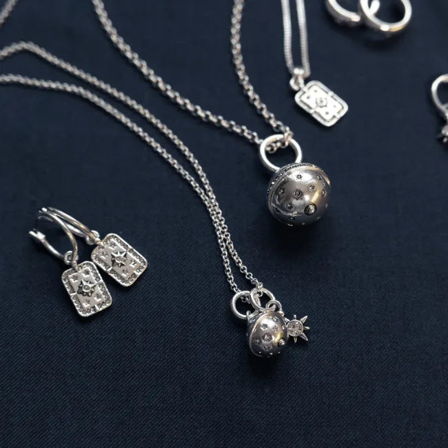 Smycke från A&C’s Astro. En kollektion inspirerad av den oändliga stjärnhimlen på en klar vinternatt. Månar och planeter dekorerade med glittrande kristaller. En tidlös och klassisk kollektion som är perfekt att kombinera lager-på-lager. Belagd med äkta silver. Kristallstenar.