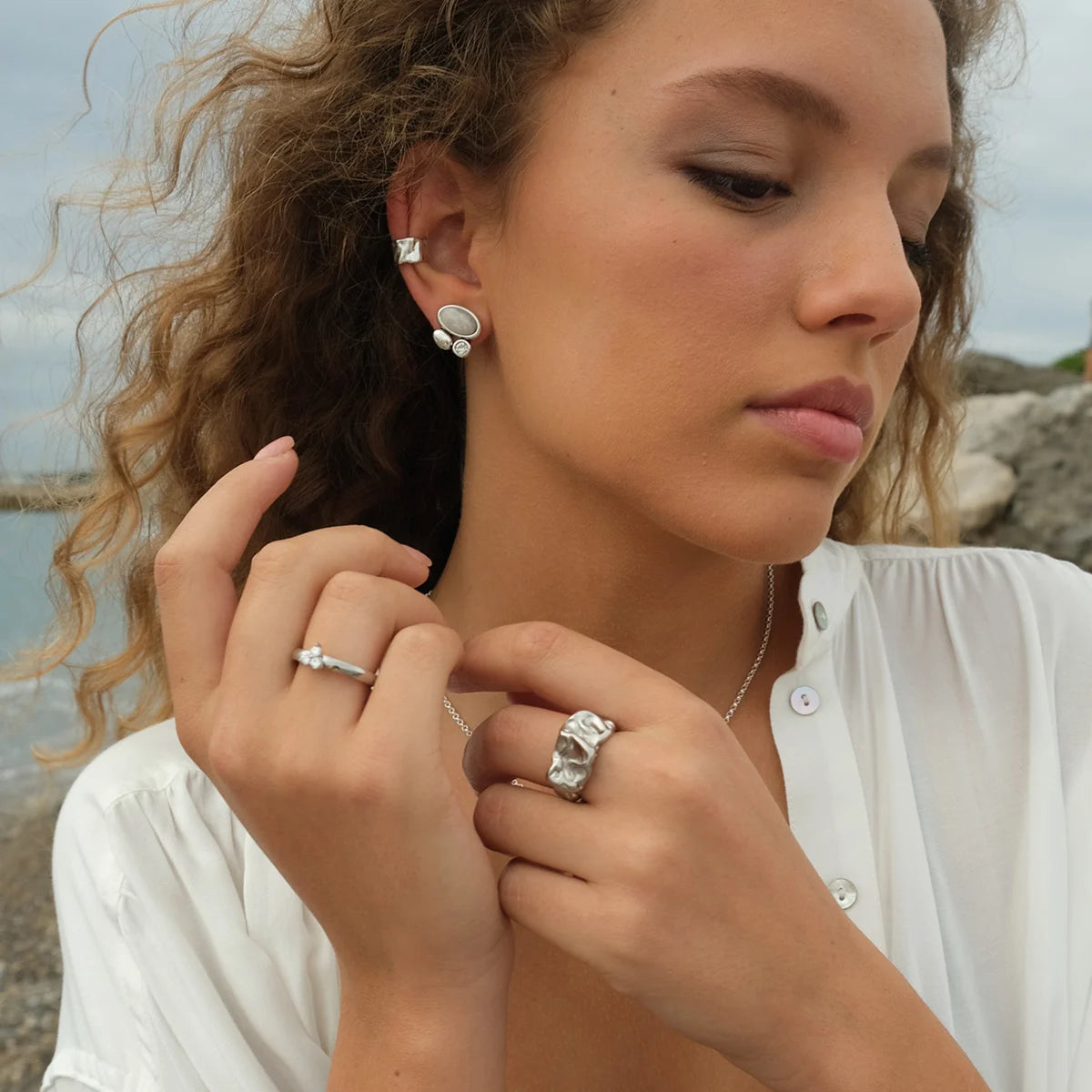 Kollektionen Organic är nedtonad och sofistikerad med ett organiskt uttryck. En tidlös och karaktäristisk kollektion som är lika fin till fest som till vardags. Designen är inspirerad av glittrande havsvatten som sköljer över mjuka stenar på stranden. Stenar och kristallastenar.