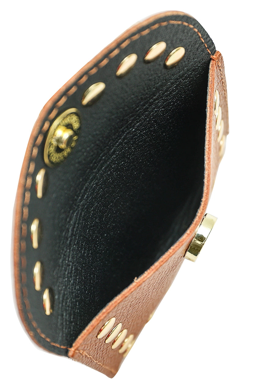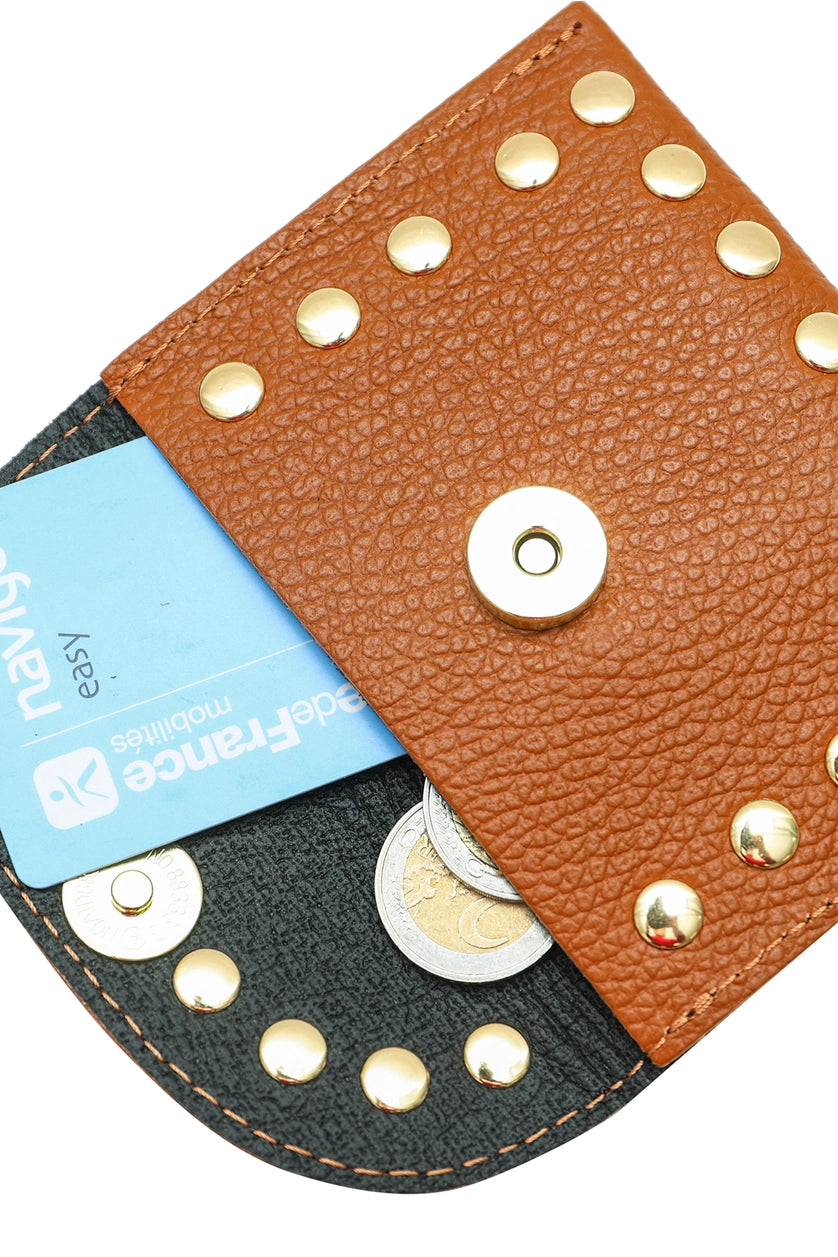 Plånbok i kornig kalvskinnsläder med magnetlås. Nitar på fliken. Mått: 12 x 9 x 0,5 cm. Finns i olika färger.